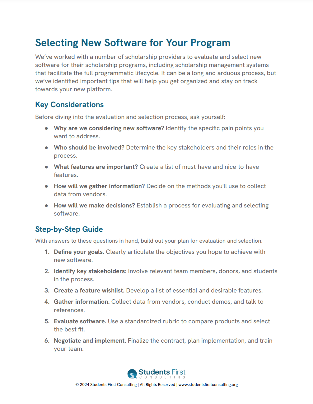 Selecting the right software for your scholarship program can significantly improve efficiency, streamline processes, and enhance impact. This tip sheet offers important questions to consider and steps to take to identify right tool for your program.