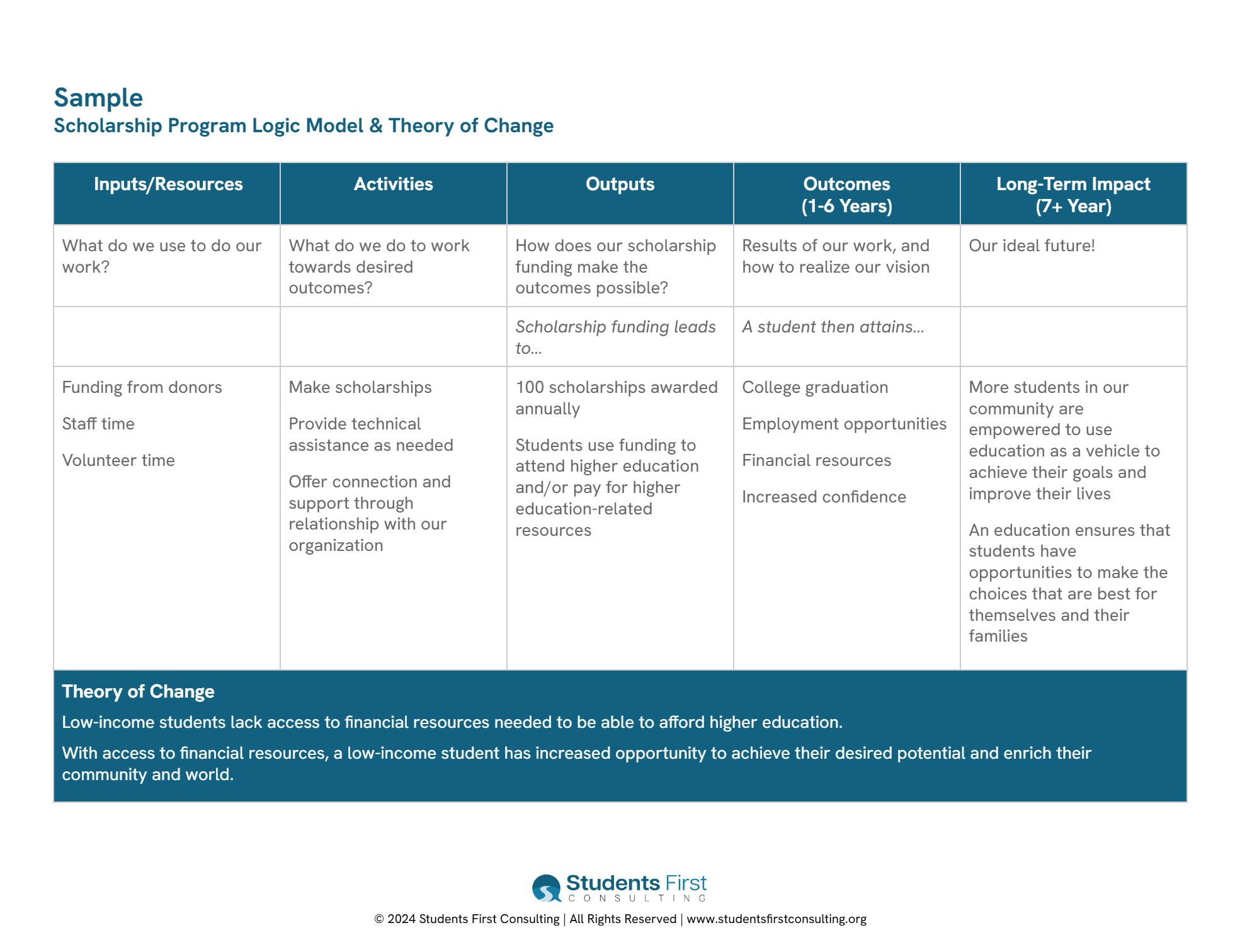 Use this resource to outline your program’s inputs, activities, outputs, and long-term impacts, in order to visualize how scholarships can empower students.