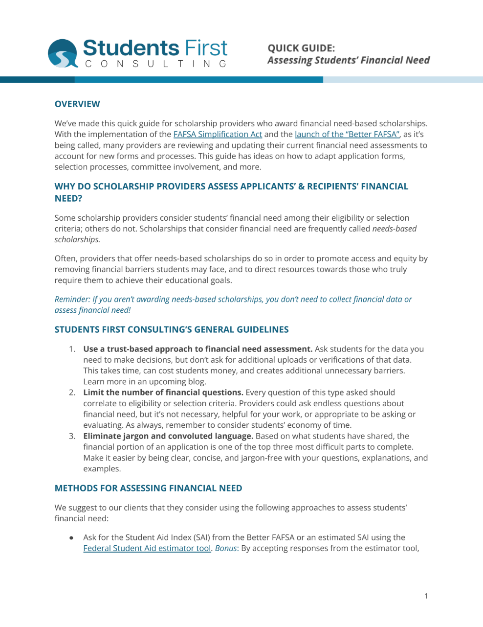 Want recommendations for how to assess applicants’ and scholars’ financial need? This guide is chock-full of ideas on how to adapt application forms, selection processes, committee involvement, and more, to best understand a student or family’s financial circumstances.